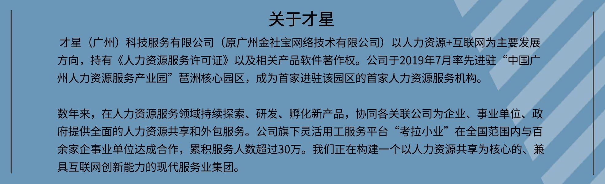 同时,才星科技基于对灵工用工模式的深刻理解和资源优势,可为企业从传统用工模式向灵活用工模式转变提供定制化、可落地的解决方案和咨询服务。致电咨询,即可免费获得一份定制化《企业用工成本优化方案》咨询电话:020-36772784