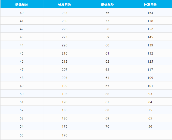 其中,根据退休年龄的不同,“计发月数”也不一样,具体情况可以在下表中查阅:
