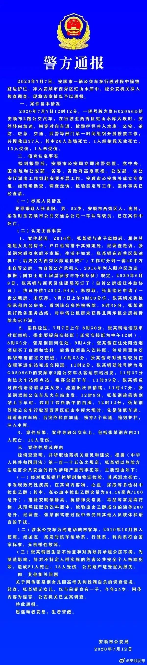 在7月12日下午,安顺市公安局发布了关于贵州公交坠湖事件的最新通报: