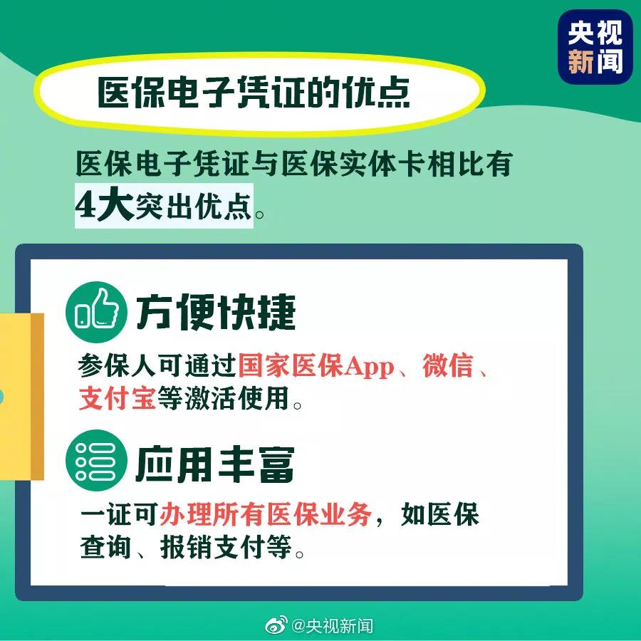 1、方便快捷。医保电子凭证不依托实体卡,参保人可通过国家医保APP,或者通过微信、支付宝等经由国家医保局认证授权的第三方渠道激活使用。