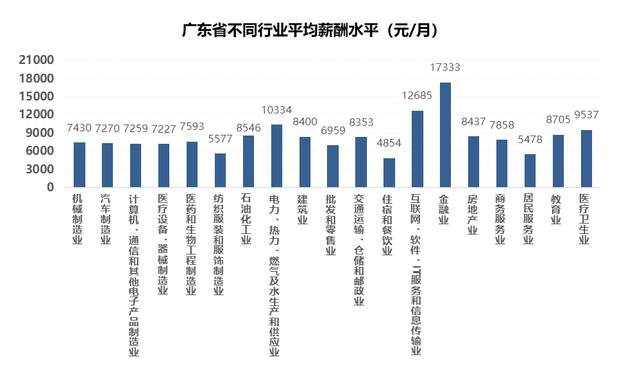 “金融业”以17333元/月的平均薪酬遥遥领先于其他行业,是全省平均薪酬水平的2.23倍;薪酬水平排名第二的是“互联网、软件、IT服务和信息传输业”,为12685元/月;薪酬水平排名第三的是“电力、热力、燃气及水生产和供应业”,为10334元/月。这三个行业平均月薪均已突破万元。平均薪酬水平最低的三个行业分别是“纺织服装和服饰制造业”(5577元/月)、“居民服务业”(5478元/月)和“住宿和餐饮业”(4854元/月),分别低于全省平均薪酬28.21%、29.49%、37.51%。