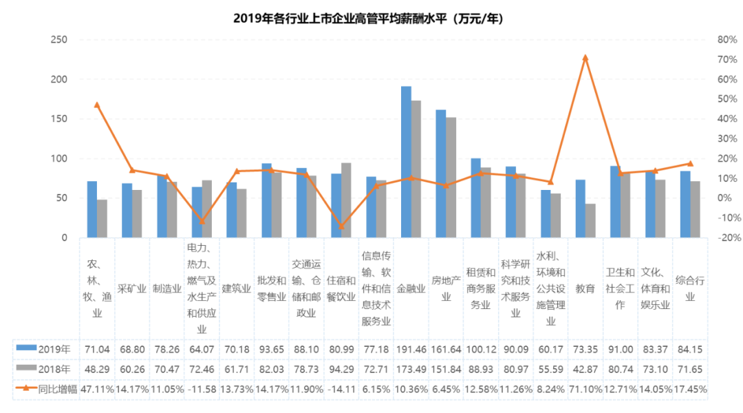 据善世获悉,从行业水平来看,金融业和房地产业依然是高收入群体的聚集地,其上市企业高管平均年薪遥遥领先于其他行业。2019年,金融业上市企业高管平均薪酬在行业排名中依然居榜首,为191.46万元/年,同比增长10.36%;房地产业排名第二,为161.64万元/年,同比增长6.45%;租赁和商务服务业排名第三,为100.12万元/年,同比增长12.58%。薪酬水平偏低的三个行业是“采矿业”“电力、热力、燃气及水生产和供应业”“水利、环境和公共设施管理业”,平均薪酬分别为68.80万元/年、64.07万元/年、60.17万元/年。