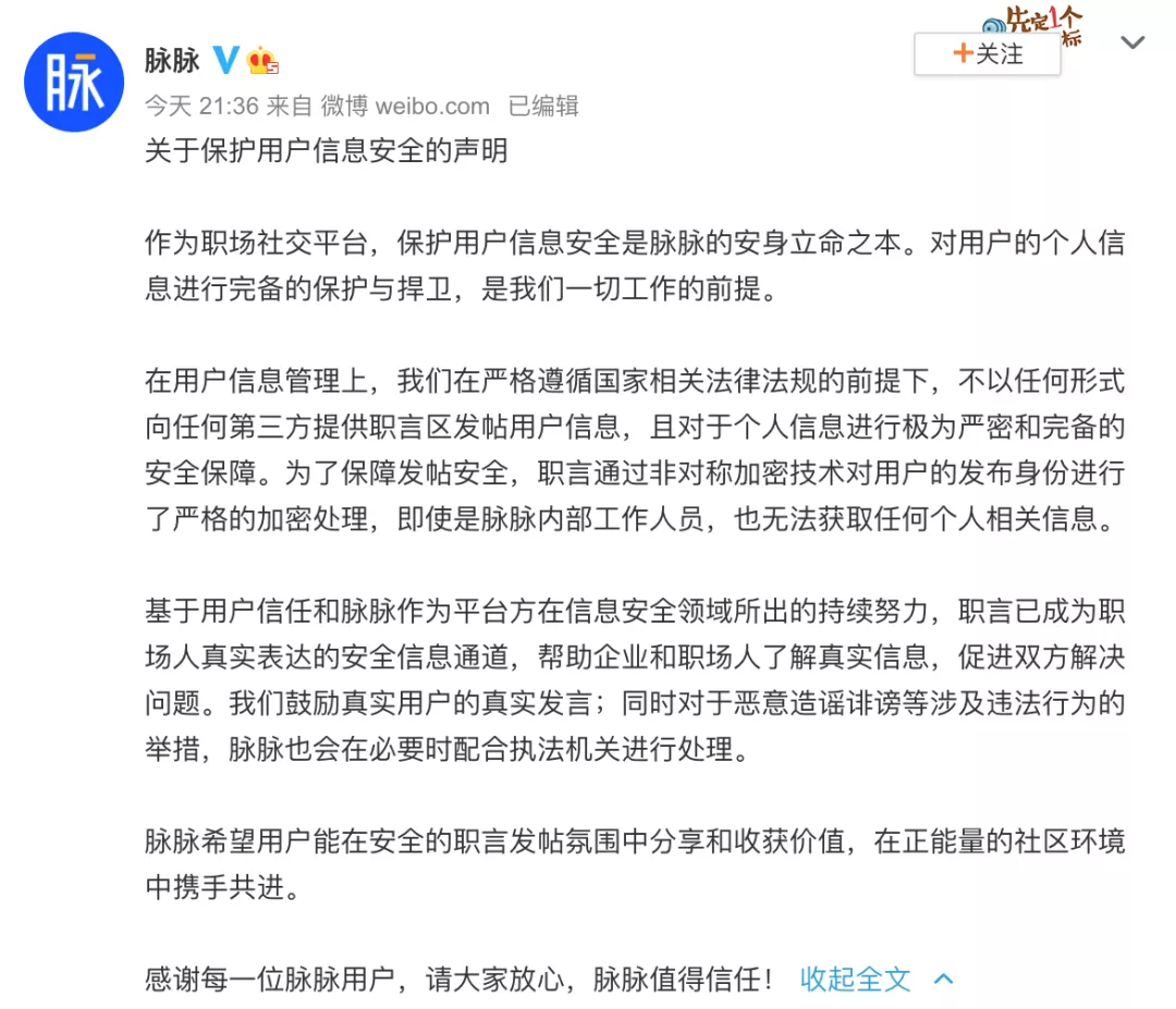 据善世获悉,事后,有网友质疑脉脉泄漏用户个人信息,对此,脉脉特意在官方微博发布声明回应:在用户信息管理上,不以任何形式向任何第三方提供职言区发帖用户信息,且对于个人信息进行极为严密和完备的安全保障。