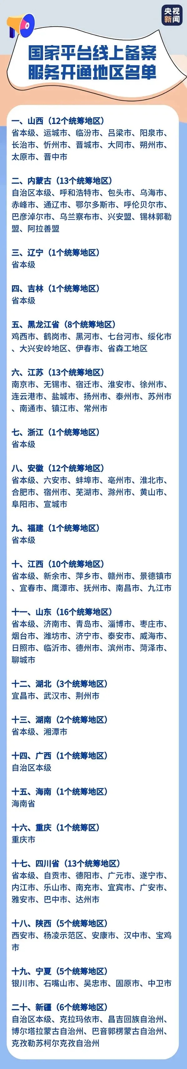 据善世获悉,目前,全国已有20个省区市开通了国家平台线上备案服务,名单见下图↓