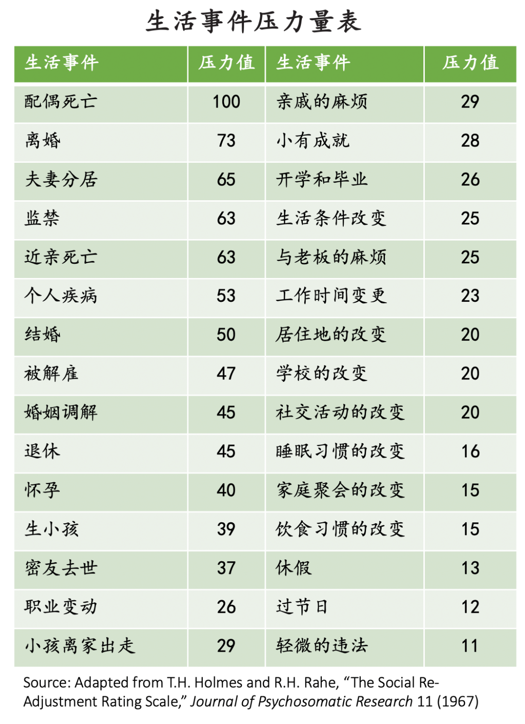 研究表明,许多生活事件被认为是相当有压力的,特别是当它们导致一个人的生活发生重大变化时。如图所示,这是美国的调研数据,也许中国会有些不太一样。
